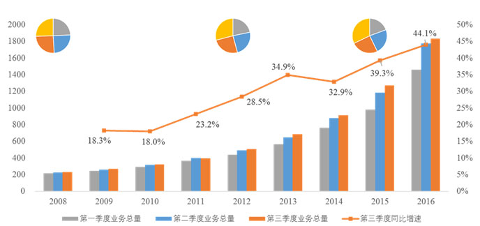 2016年是全面建成小康社会决胜阶段的开局之年,也是深入推进结构性改革的攻坚之年。前三季度,国民经济运行总体平稳、稳中有进、稳中提质、好于预期。全行业在党中央、国务院的坚强领导下,以落实《国务院关于促进快递业发展的若干意见》为主线,着力推进供给侧结构性改革,行业总体保持了持续快速的发展态势。前三季度行业发展超出预期,为顺利完成全年任务目标奠定了坚实基础。 一、总体运行情况 (一)全行业情况 前三季度,邮政企业和全国快递服务企业业务收入(不包括邮政储蓄银行直接营业收入)累计完成3783亿元,同比增长32.6%;业务总量累计完成5072.5亿元,同比增长47.3%。 (二)邮政普遍服务情况 前三季度,邮政函件业务累计完成28亿件,同比下降21.2%;包裹业务累计完成2026.7万件,同比下降40%;报纸业务累计完成134.6亿份,同比下降4.8%;杂志业务累计完成6.5亿份,同比下降15.5%;汇兑业务累计完成4461万笔,同比下降30.1%。 (三)快递服务情况 前三季度,全国快递服务企业业务量累计完成211亿件,同比增长54%;业务收入累计完成2703.7亿元,同比增长43.9%。其中,同城快递业务量累计完成51.1亿件,同比增长40.1%;业务收入累计完成385.3亿元,同比增长41.4%。异地快递业务量累计完成155.6亿件,同比增长59.3%;业务收入累计完成1438.6亿元,同比增长40.1%。国际及港澳台快递业务量累计完成4.3亿件,同比增长47.1%;业务收入累计完成300.8亿元,同比增长14.1%。 二、总体运行特点 行业规模增速高位企稳。前三季度,邮政行业业务总量同比增长47.3%,业务收入同比增长32.6%,与去年同期相比,业务总量和业务收入增速分别提升了12.6和8.2个百分点。 从月度来看,进入三季度以来,业务规模累计增速开始放缓。与去年相比,同比增速的变化幅度总体呈现梭型态势。业务总量同比增速的提升幅度从年初的12.5个百分点扩大至4月份的20.8个百分点,之后持续收窄,9月回归到12.6个百分点。业务收入则在经历了同样的发展趋势后,在9月出现小幅回弹,提升幅度较上月回升了0.9个百分点。与去年先抑后扬、逐渐发力的增长趋势不同,今年上半年全行业实现了增速连续攀升的强势开局,此后增速稳中趋缓、缓在高位。 图1 邮政行业业务总量和业务收入月度增速变化对比(2015-2016) 从季度来看,第三季度属于增速和占比都较为稳定的时间段。增速方面,与业务总量整体发展形势保持一致,第三季度同比增速从2009年的18.3%波动上升至今年的44.1%,增幅的提升速度高于第一、二季度,占比方面第三季度则长期稳定在25%左右。 图2 邮政行业业务总量和业务收入季度增速变化对比(2008-2016) 传统邮政业务持续下降。前三季度,普遍服务业务量累计完成169.8亿件,同比下降8.5%。各项主要业务的业务量均延续下降态势。函件、包裹和汇兑业务同比降幅均超过20%,订销报纸和杂志业务降幅较去年同期有所扩大。业务收入方面,包裹业务收入有所回升,函件业务收入基本保持稳定,报刊发行收入和代理汇兑收入有所下降。 快递业务增速略有放缓。前三季度,快递业务量累计完成211亿件,同比增长54%,较去年同期提高了8个百分点;快递业务收入累计完成2703.7亿元,同比增长44%,较去年同期提高了10.8个百分点。与行业整体情况相似,三季度快递业务增速较上半年的高位也出现了小幅回落,但9月份快递业务收入同比增幅创出新高,达到50.2%,比业务量增幅高出2.5个百分点。分专业来看,与去年同城业务主导增长的模式不同,今年异地业务量增速明显反弹。前三季度,异地业务量同比增幅基本保持在60%左右,超过同城业务增速近20个百分点,占全部快件量的比重持续上升至73.8%。 民营快递企业继续领跑。前三季度,民营快递企业业务量完成190.2亿件,同比增长57.3%,业务收入完成2247.7亿元,同比增长50.3%。国有快递企业业务量和业务收入分别完成19.3亿件和280亿元,同比分别增长28.8%和26.5%,延续了今年以来较好的发展势头。从市场份额来看,民营快递企业继续保持绝对领先,其中业务量份额达90.2%,业务收入份额达83.1%。 西部地区收入增速提升。前三季度,东、中、西部快递业务量同比分别增长52.5%、61.9%和58%,业务收入同比分别增长42.9%、48.6%和48.8%。中部地区继续领跑快递量增速,在三大区域中成长优势明显。同时西部地区保持了快速增长势头,业务收入增速超过中部地区。东、中、西部地区快递业务量的比重分别为81%、11.8%和7.2%,业务收入比重分别为81.1%、10.7%和8.2%,地区间结构基本保持稳定。 经营邮政通信业务企业稳步发展。前三季度,经营邮政通信业务企业共完成业务收入2.3亿元,其中收寄环节收入实现841.1万元,分拣环节收入实现2.1亿元,投递环节收入实现1301.3万元。收寄函件业务量达到3422万件,占全部函件量的比重为1.2%,其中收寄国际小包业务量达到3262.9万件,占全部国际小包的比重为6%。收寄包裹业务351.3万件,占全部包裹业务量的比重为17.5%。 |