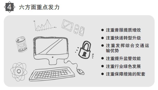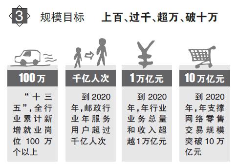 三个全面 明确行业发展方向 问:《规划》对于统筹引领邮政业持续健康发展具有重要意义,行业未来发展的路径、方向都体现在了《规划》中。那么,在编制过程中,如何实现让《规划》发挥引领作用? 答:在《规划》的编制过程中,我们着力做到了“三个全面”,以此将行业发展和国家经济社会发展全局紧密地结合在一起,从而发挥《规划》的引领作用。 一是全面贯彻新理念新战略。《规划》将贯彻“四个全面”战略布局作为基本指导思想,明确了“全面建成与小康社会相适应的现代邮政业”的总体目标,部署了“深化行业改革”的重点任务,提出了“推进法治邮政建设”和“提高党建工作水平”等保障措施。《规划》以“五大发展理念”为指引,明确了推动行业创新发展的基本路径,指明了发展理念、业务领域、服务模式创新的具体方向,提出了推动邮政普遍服务均等协调发展、快递城乡普惠、建设绿色邮政、支持跨境寄递发展、服务“一带一路”建设等具体目标、任务和工程。同时,设置了新增就业岗位的具体指标,提出网络设施共享、资源集约利用的任务,并将共享作为行业核心价值理念之一。 二是全面落实国家重大决策部署。《规划》立足服务经济社会发展全局谋划邮政业发展,着力发挥邮政业在稳增长、促改革、调结构、惠民生中的积极作用。《规划》全面贯彻国家“十三五”规划纲要涉及邮政业的内容,对提升邮政服务水平、加强快递设施建设、强化邮政安全管理等部署进行实化细化,明确任务措施、安排建设工程。《规划》系统落实国务院促进快递业发展意见,将“互联网+”作为行业发展的整体战略,把培育壮大快递企业作为重点目标,协调推进快递“向西向下向外”、“上车上船上飞机”和寄递渠道安全监管“绿盾”工程。《规划》做到国家有部署、行业抓落实。 三是全面描绘行业发展蓝图。《规划》提出的奋斗目标是:到2020年,全面建成与小康社会相适应的现代邮政业,推动我国由邮政大国向邮政强国迈进。基于此,《规划》提出推动行业发展的基本思路是:贯穿一条主线,实现两个转变,打造三个优势,实现五个跨越。就是以推动行业改革和创新发展为主线,转变发展路径和发展方式,打造邮政业在推动流通方式转型、促进社会消费升级、引领物流发展三个方面的优势,推动邮政业在发展规模、创新能力、服务能力、服务水平、竞争实力五个方面实现大幅跨越。 发展仍是邮政业面对的基本问题,行业只有持续快速发展,才能满足不断增长变化的服务需求。《规划》在发展规模方面提出“上百、过千、超万、破十万”的目标。具体来讲,就是“十三五”期间,全行业累计新增就业岗位100万个以上;到2020年,邮政行业年服务用户超过千亿人次,年行业业务总量和收入超越1万亿元,年支撑网络零售交易规模突破10万亿元。同时,《规划》明确了创新能力、服务能力、服务水平、竞争实力等方面的目标,着力推动行业提升发展质量和水平。 三个突出 呈现行业改革路径 问:制定行业规划的目的在于统筹引领行业发展,为市场主体的行为提供导向,为相关管理部门履职提供指引,为行业明确共同的发展愿景。请问在这方面,《规划》呈现了哪些亮点呢? 答:“十二五”时期,行业实现了快速发展。但与此同时,一些突出的矛盾和问题也逐步显现出来。推动行业持续健康发展,要有新视角,要聚焦问题,要改革创新。此次发布的《规划》在这三个方面进行了回应。 一是突出新定位。《规划》开宗明义,结合国务院赋予邮政业相关新的功能定位,明确提出“邮政业是国家重要的社会公用事业,是推动流通方式转型、促进消费升级的现代化先导性产业,在国民经济中发挥着基础性作用”。 二是突出问题导向。《规划》坚持问题导向,从用户服务需求、产业发展规律、可持续发展等方面,梳理出邮政业发展面临的突出问题和短板,包括:快递发展质量不高、邮政普遍服务亟待提质创新、行业基础薄弱、发展模式单一、区域发展不均衡、寄递渠道安全压力增大等。针对这些核心问题,聚焦重点、综合施策、精准发力,《规划》提出了一系列解决问题、化解矛盾、补齐短板的任务措施和建设工程。比如:引导企业从价格竞争向服务品质竞争转变,实施品牌和差异化发展战略;推动普遍服务的快捷化发展,改进邮件收寄和投递方式,提升服务水平;推进分拨中心、集散枢纽建设;着力服务先进制造业、跨境电商和现代农业,发展工厂快递、越洋快递和农商快递;支持西部地区改善基础设施,提升西部地区服务网络的均衡度和稳定性;加强安全监管,全面落实收寄验视、实名收寄、过机安检三项制度。 三是突出改革创新。《规划》以“发展出题目,改革做文章,创新求突破”为基调,将“推动行业改革和创新发展”作为发展主线。《规划》提出,推进行业供给侧结构性改革,完善邮政市场环境和机制,扩大有效和中高端的服务供给;深化邮政行政审批制度改革,优化行政流程,简化快递业务经营许可程序,精简分支机构和末端网点备案手续;推动邮政企业深化改革,增强国有企业的活力和影响力,推动快递企业建立现代企业制度,完善运营机制,有效利用资本市场发展壮大。《规划》提出,将创新贯穿于行业发展的各环节,推动发展理念由产品思维向用户思维转变,促进市场开放、资源共